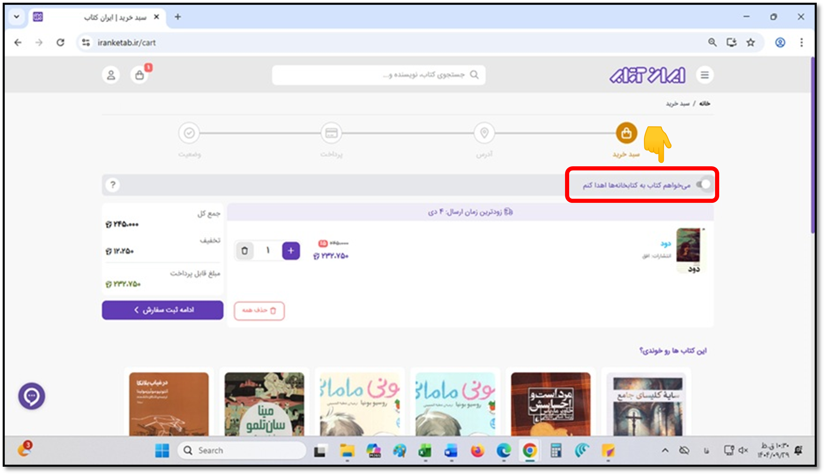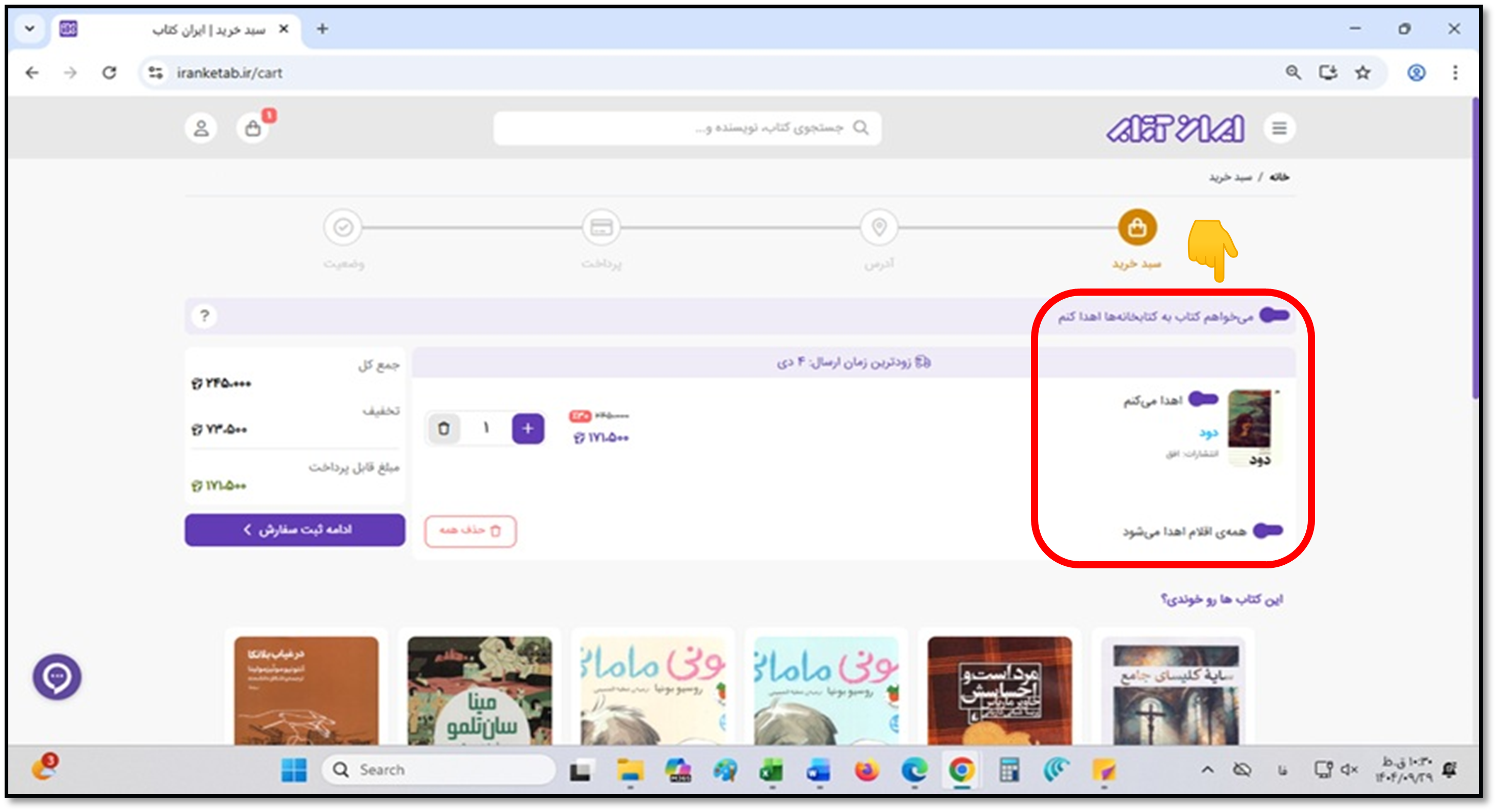 3. در این مرحله با انتخاب گزینههای "میخواهم کتاب به کتابخانهها اهدا کنم" در قسمت بالای صفحه، کتابهای خریداری شده به کتابخانه موردنظر ارسال خواهد شد.