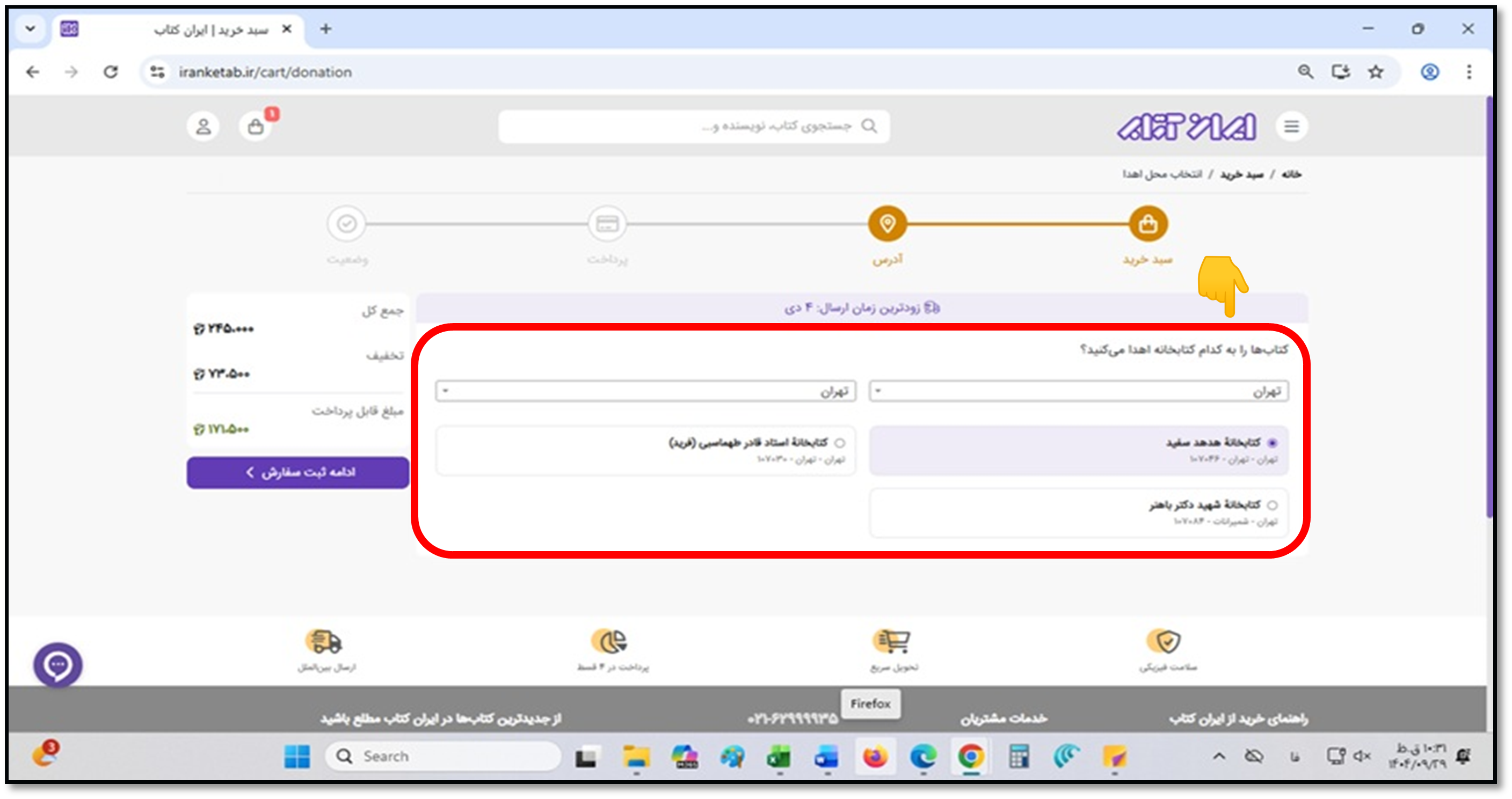 5. در این مرحله، امکان انتخاب نام استان، شهرستان و کتابخانه موردنظر جهت ارسال کتابهای خریداری شده از سایت ایران کتاب میسر است.