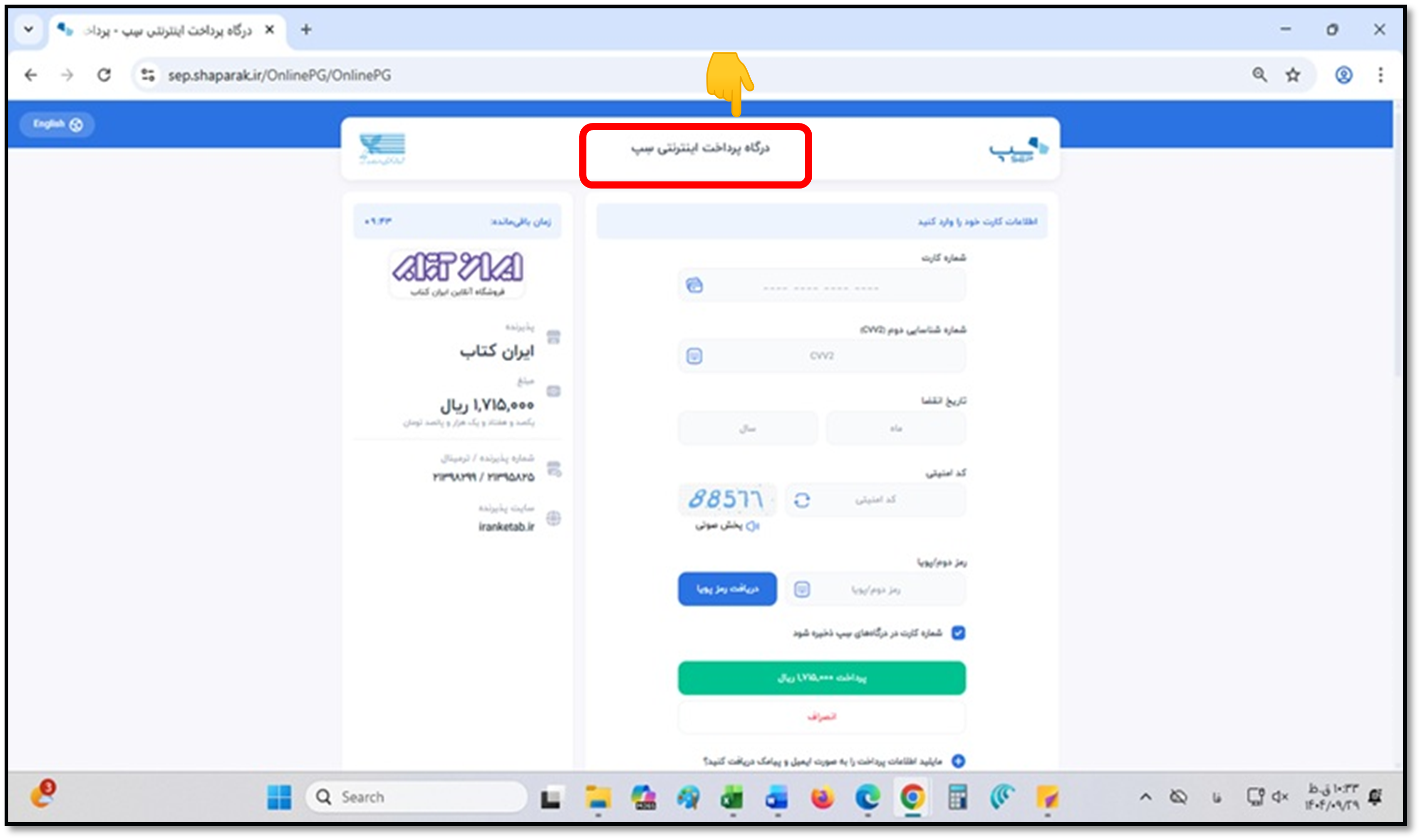 7. در مرحله آخر، با اتصال به درگاه پرداخت اینترنتی، امکان پرداخت مبلغ کتابهای خریداری شده از سایت ایران کتاب فراهم میباشد.
